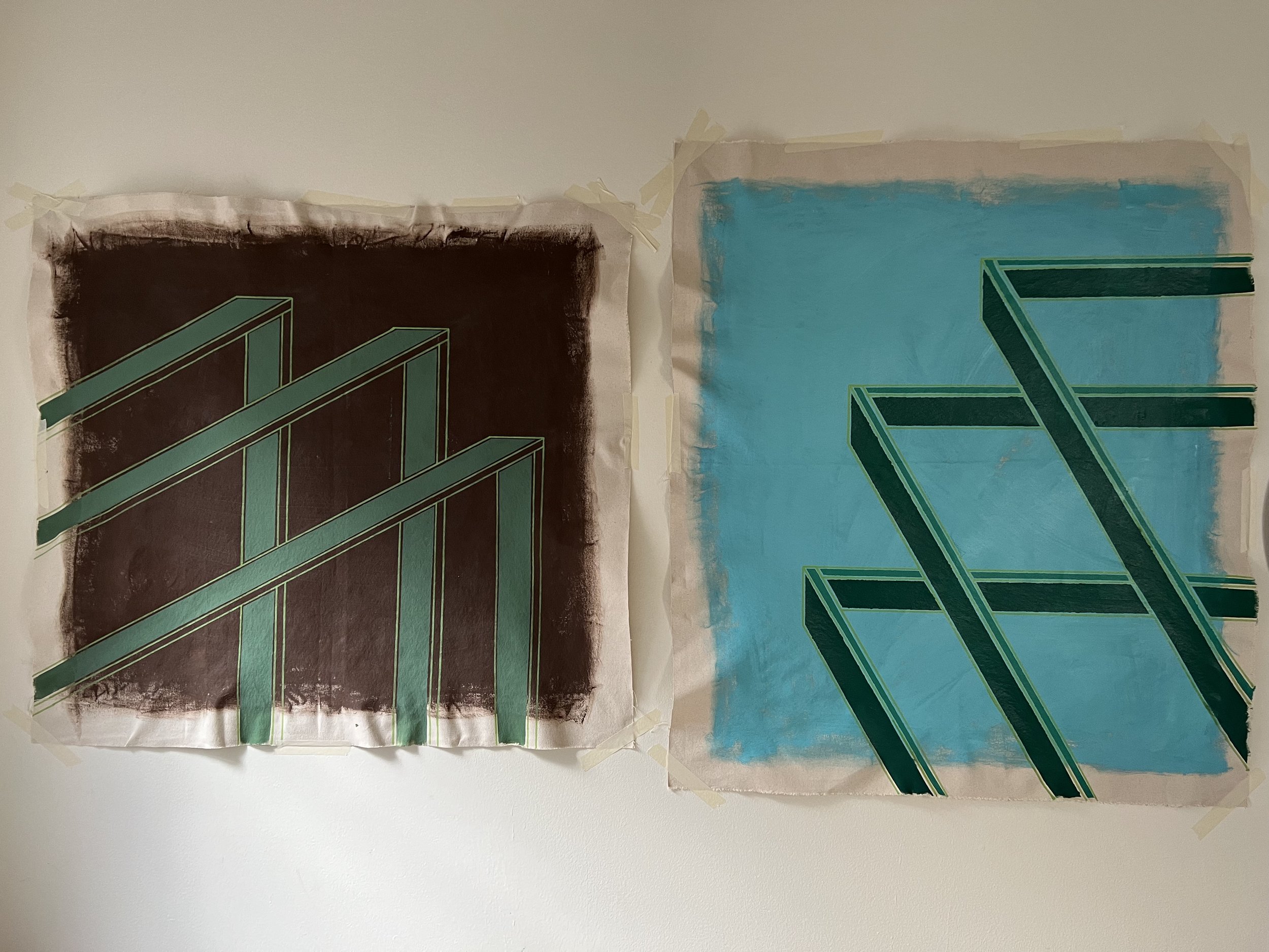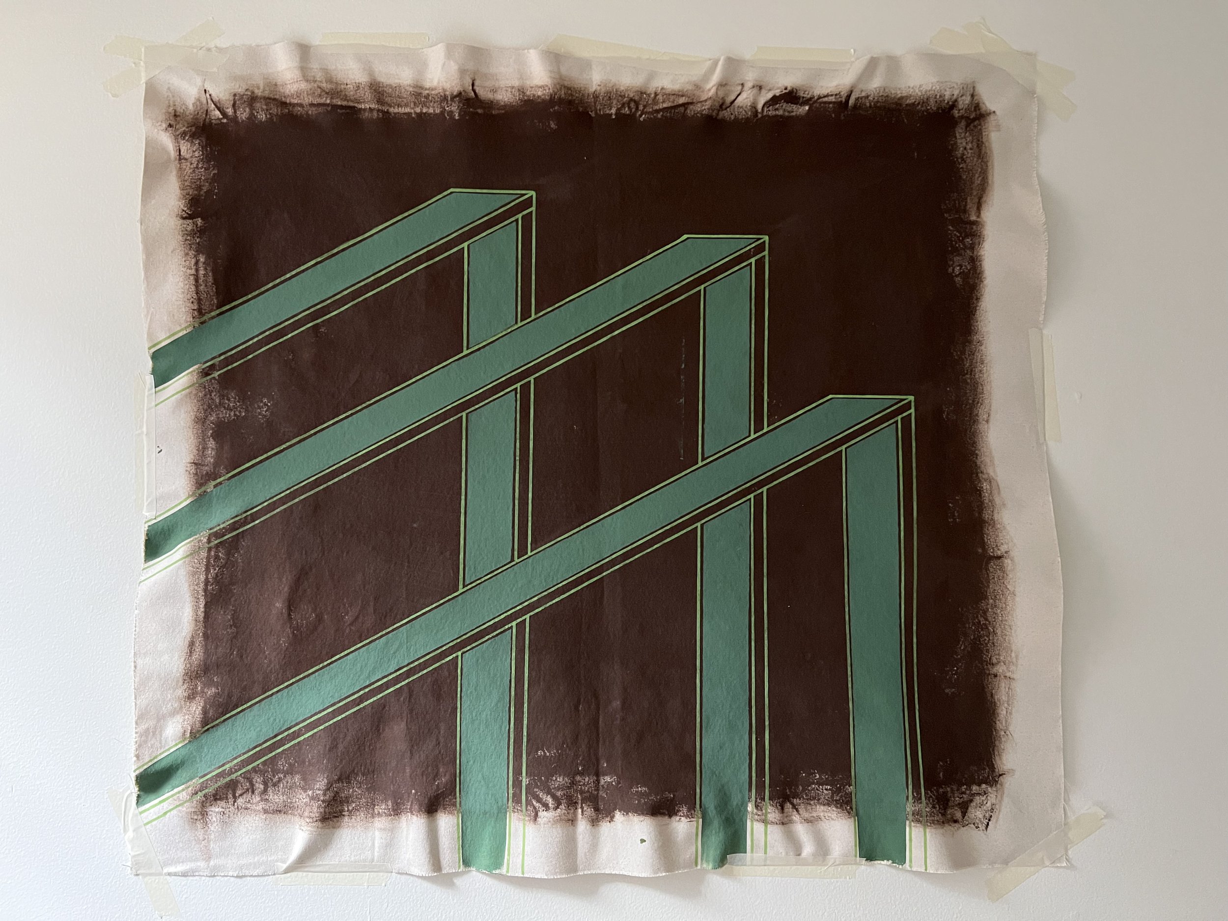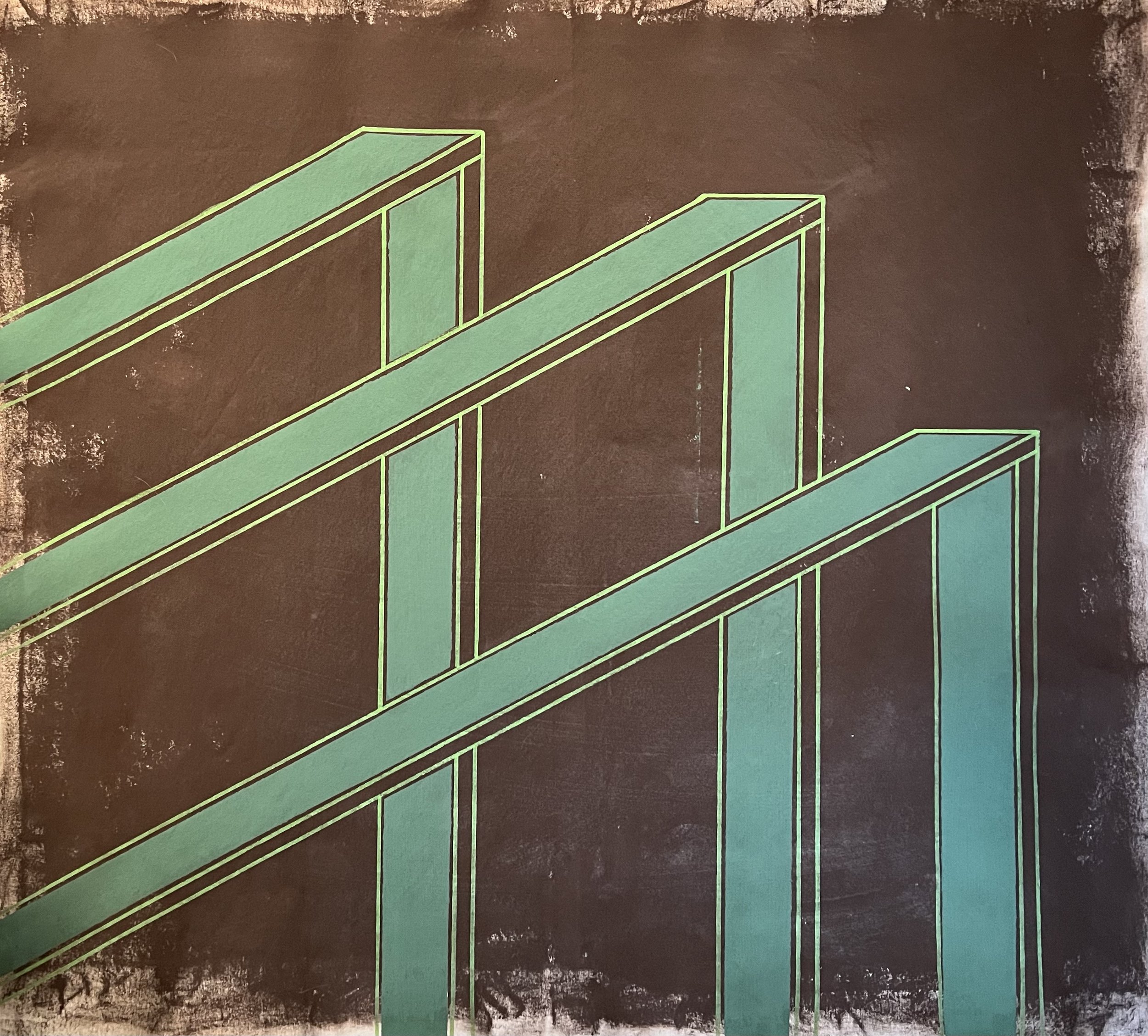 3 Green Frames on Brown (#11), 2023, oil & acrylic on canvas, 3x3.5'