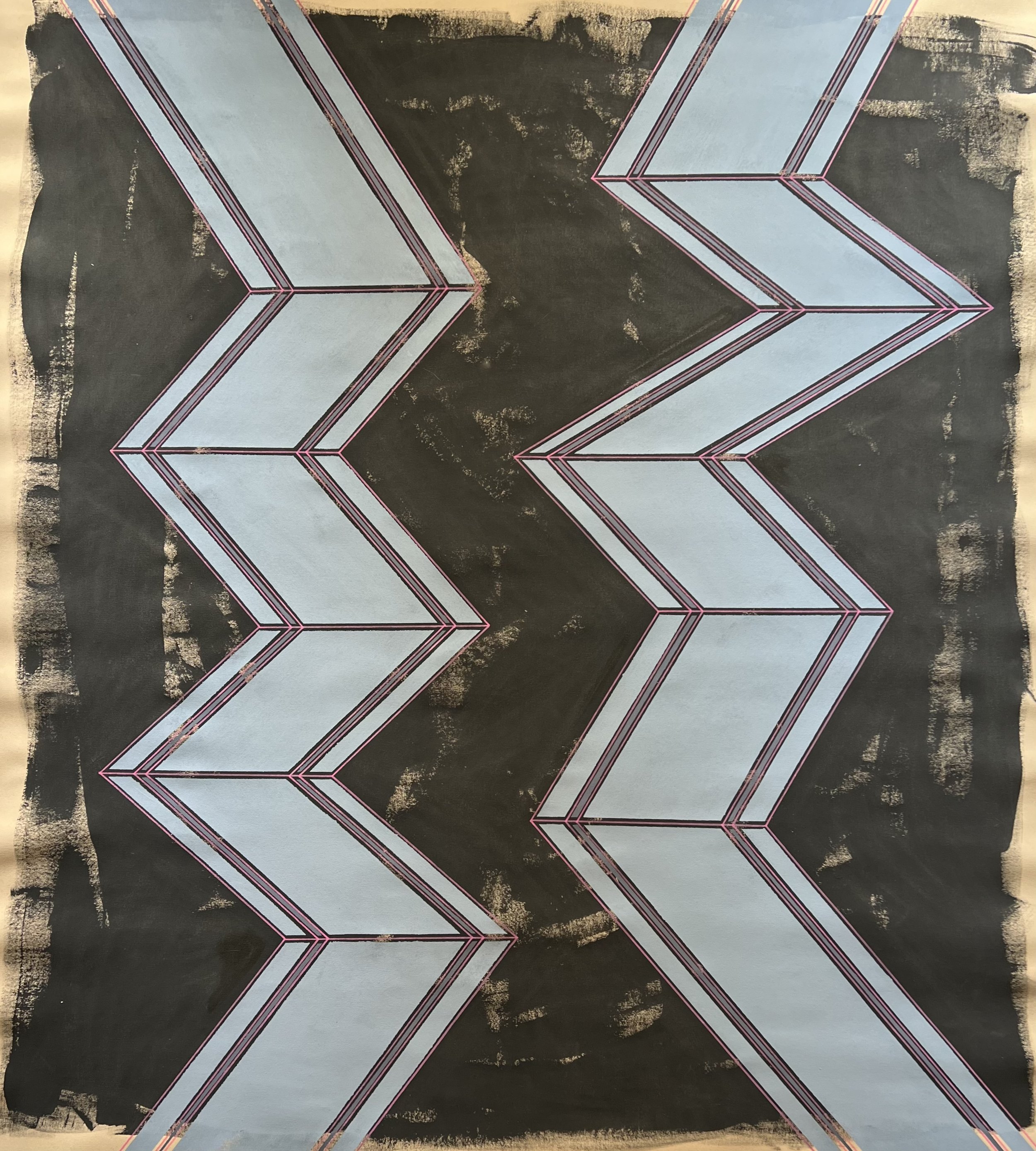 2 Huge Periwinkle Folded Diagonals on Charcoal (#23), 2024, oil & acrylic on canvas, 6x7'